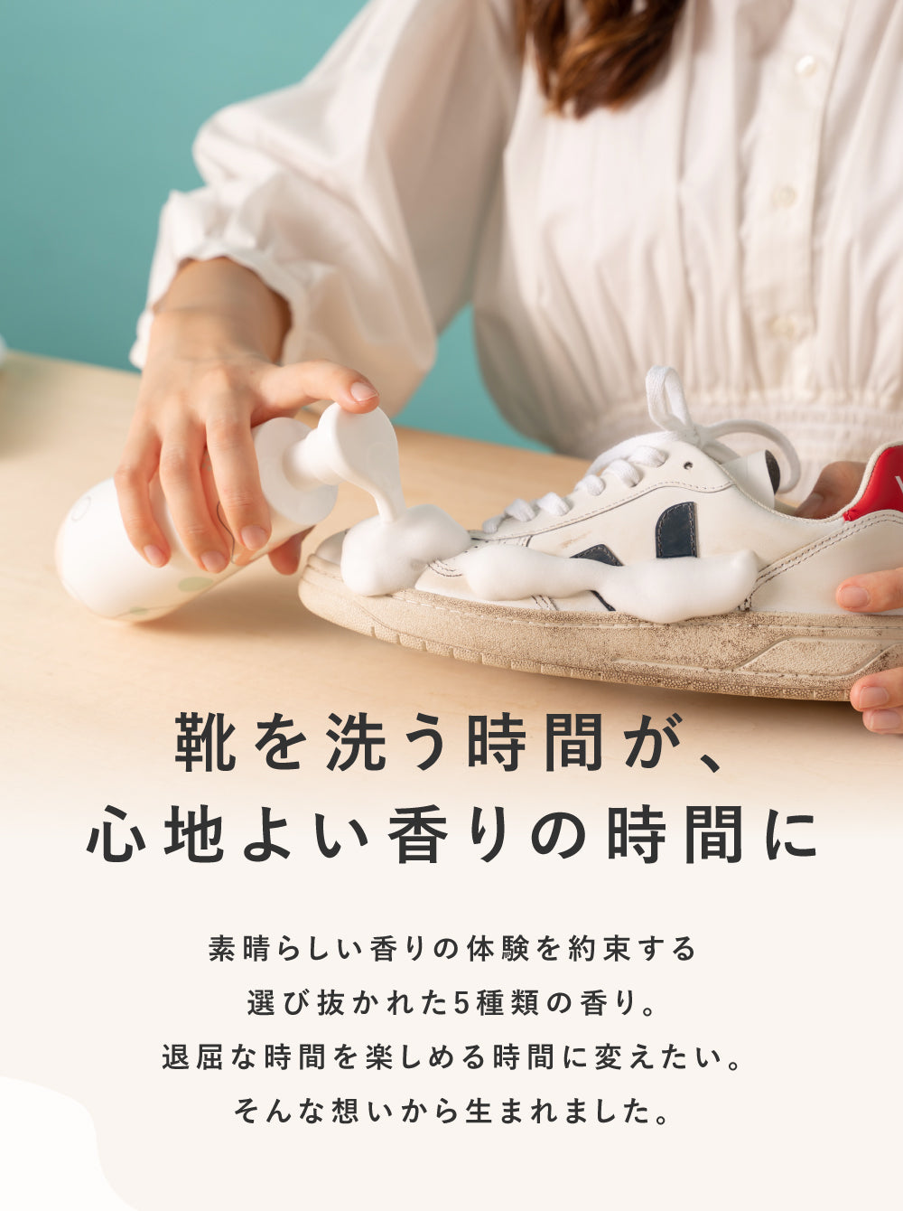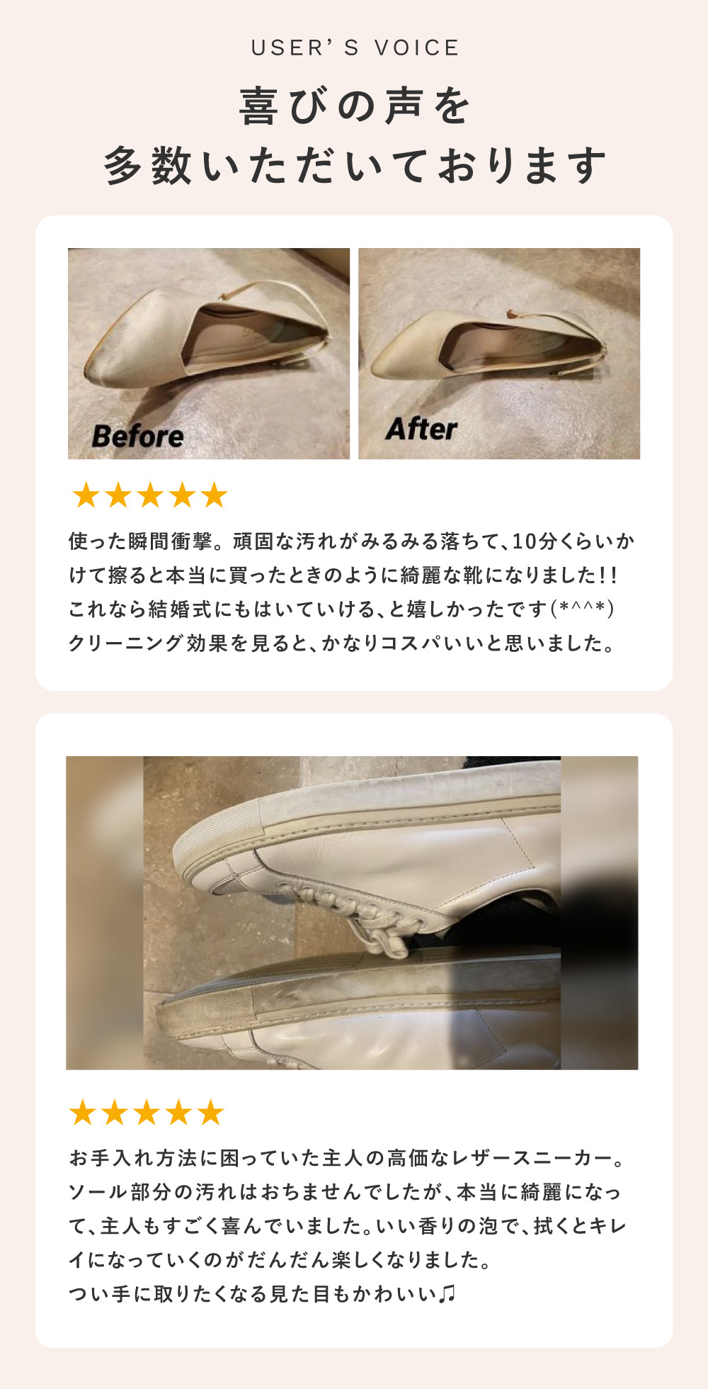 高価なレザースニーカーも安心。泡で拭くだけで見違え、家族の泥汚れも翌日にはきれいに。香りも好評。